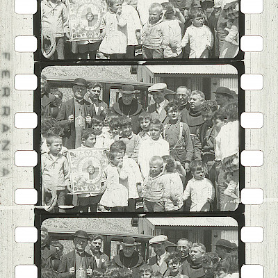 Visita del Monseñor Copello al Colegio Salesiano Dean Funes, Instituto Don Bosco en Comodoro Rivadavia, provincia de Chubut, como parte de las Misiones Salesianas en la Patagonia. Lo reciben autoridades de la de la Dirección Nacional de Minas y de Yacimientos Petrolíferos Fiscales. Desfile de niños con guardapolvos. Ceremonia ante el pozo petrolero n°2, tras veinte años del descubrimiento de petróleo en la zona. Equipo explorador de la Dirección Nacional de Minas: José Fuchs, jefe de sondeos; Humberto Beghin. auxiliar; Gustav Kunser y Juan Martínez, foguistas; Florentino Soto, Antonio Viejos, Joaquín Dominguez, Jose Barrelos, Padre Gelhorn, peones. Presencia de Monseñor Fray José María Bottaro. Visita a los yacimientos de YPF. Finaliza con los prelados a bordo del buque Ministro Frers.